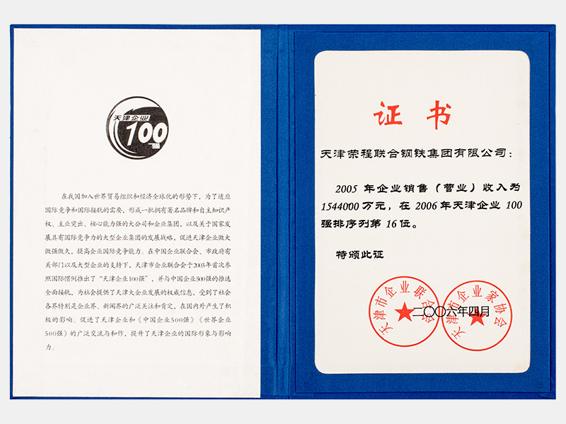 2005年企業(yè)銷售(營(yíng)業(yè))收入為1544000萬(wàn)元,在2006年天津企業(yè)100強(qiáng)排序列第16位